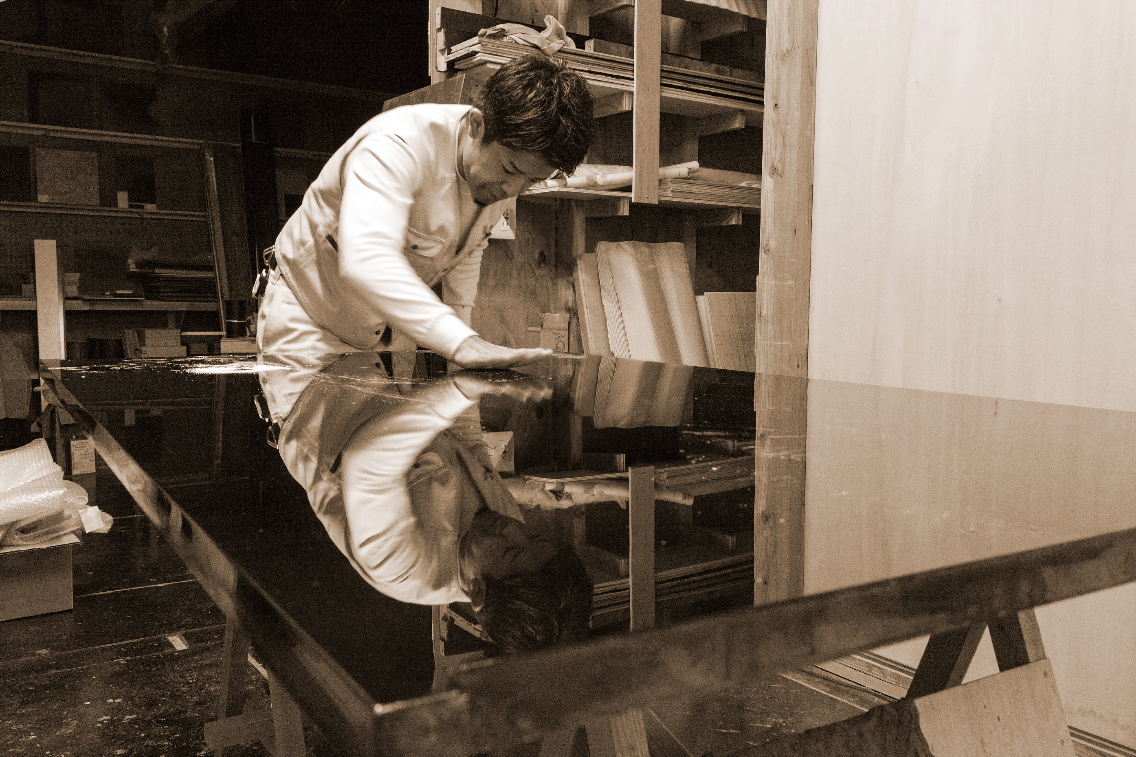 「建材は美術作品のように『触れない』ものではない。人が触れてもいいように耐久性も必要。漆を用いた建材を不燃材として建築基準法をクリアするためには、漆工芸特有の美しさとその風合いの経年変化を生かしながら『安心して人の生活や営みに寄り添える建材』を突き詰める必要がある」と語る有賀建樹。自身が継承したその漆技術の更なる進化と「建築」の世界への展開へ挑戦し続ける。