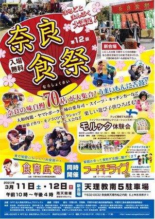 「第12回 奈良食祭」は2023年3月11日(土)・12日(日)、午前10時から、午後4時まで開催されます!会場は奈良県天理市杣之内町の「天理教南5駐車場」(石上神宮西側すぐ)です。