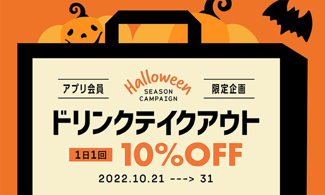 秋の行楽やハロウィンなど、屋外でのイベントが増えるシーズンにドリンクのテイクアウトをより手軽に楽しんで頂けるよう、アプリ会員向けにドリンクテイクアウト10%オフのクーポンをキャンペーン期間中毎日配信致します。また、このキャンペーン期間よりドリンクのテイクアウトはレジ袋からペーパーバッグに変更することでプラスチック削減と共に、利便性向上にもつなげます。