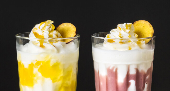 スイートポテトスムージー パープル/イエロー」は、なめらかな口当たりとクリーミーな味わいが特徴のドリンクです。ミルク感たっぷりの「バニラスムージー」をベースに、“ナイト”には「紅いもペースト」、“ムーン”には「さつまいもペースト」とそれぞれのカラーをイメージしたお芋のペーストを使用。