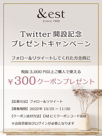 &est公式ツイッターをフォロー&リツイートいただくと、&est公式サイトで使える300円OFFクーポンをもれなく全員にプレゼント。【キャンペーンの詳細はこちら】https://twitter.com/andest_official