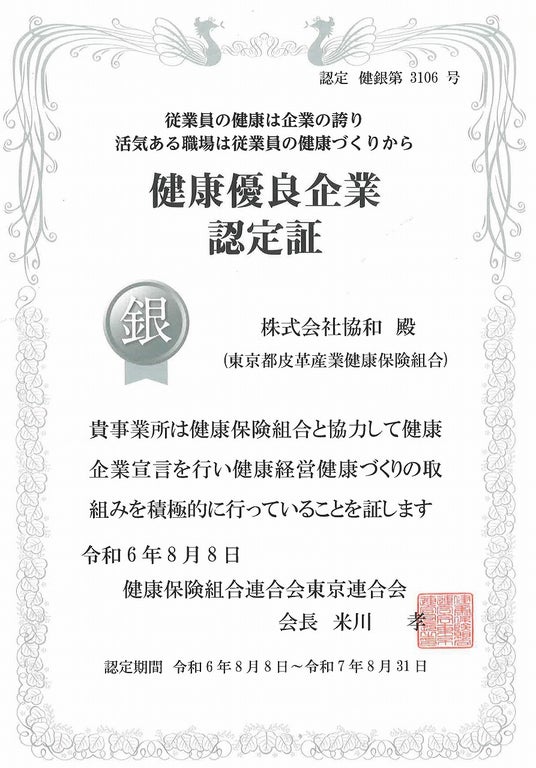 株式会社協和(本社:東京都千代田区、資本金:9,800万円、代表取締役社長:古田嶋徹)は、2024年8月8日付で健康保険組合連合会東京連合会より健康優良企業「銀の認定」を取得しました。