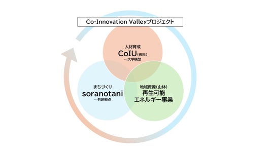 まずは飛騨の地でそういった課題を解決すべく、地域資源をエネルギー産業に活用した再生可能エネルギー事業、まちづくりの拠点となる共創拠点の設立を行います。また、このような地域の循環経済を生むような産業興しができる人材育成を目指し、大学の設立構想も進展しています。この3つが循環するプロジェクト名を「Co-Innovation Valley」と命名しました。