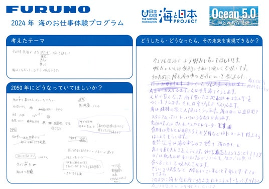 現在の陸での暮らしをベースに海へと生活拠点を広げた際、どのような未来になっているのか。その際の移動手段や食料、エネルギーの確保、ごみ処理など細やかな部分まで真剣に考えて表現いただきました。人が便利に暮らすだけでなく、動植物がのびのびと暮らし、環境にも優しい素敵な未来が描けたのではないかと思います。柔軟かつ楽しいアイデアがたくさんでてきて、想像力や可能性にワクワクすると同時に、我々大人も「海との共存共栄」の方法を模索していかなければならないと改めて感じました。