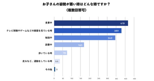 子どもの姿勢が悪くなる場面を聞いたところ、最も多かったのが「食事中」(69.5%)、次いで「テレビ視聴やゲームなど画面を見ている時」(64.5%)、「勉強中」(57.9%)という結果でした。動いている時より、椅子に座るなど一定の姿勢を持続する場面で、姿勢が悪くなる子どもが多いことがわかります。「授業参観で姿勢の悪さが目立っていた」「写真で姿勢の悪さがよくわかる」など、自宅以外の場所で姿勢の悪さに気づいたという声もありました。