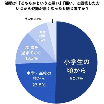 「姿勢は悪い」「姿勢はどちらかというと悪い」と回答した人に、いつから姿勢が悪くなったか聞いたところ、最も多かったのが「小学生から」(50.6%)、次いで「中学・高校から」(23.8%)と、4人に3人は6~18歳の頃から姿勢が悪かったことがわかります。