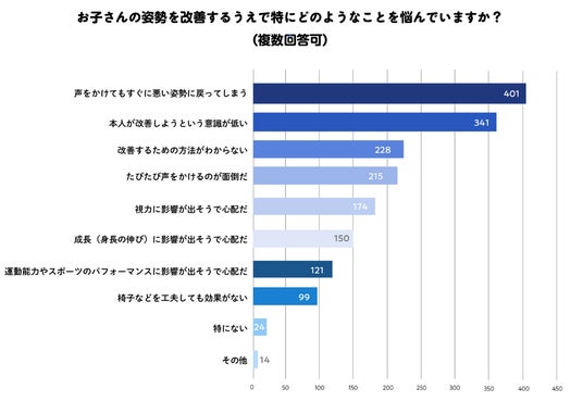 注意をしても「すぐに悪い姿勢にもどる」(66.5%)、「本人の改善しようという意識が低い」(56.6%)など、子ども側の意識の低さに課題を感じている人が多い結果に。一方で保護者自身が課題に感じている悩みとして、「注意するのが面倒」(35.7%)、「改善の仕方がわからない」(37.8%)という声も多く聞かれました。姿勢を改善してほしいと思いながらも、良い方法が見つかっていないことがわかります。