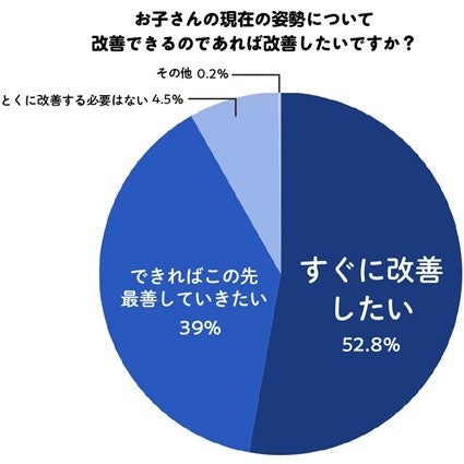 また、53%の保護者が子どもの現在の姿勢を「すぐに改善したい」と回答。「できればこの先改善したい」(39.1%)と合わせると、9割以上の保護者が子どもの姿勢を改善したいと思っていることがわかります。