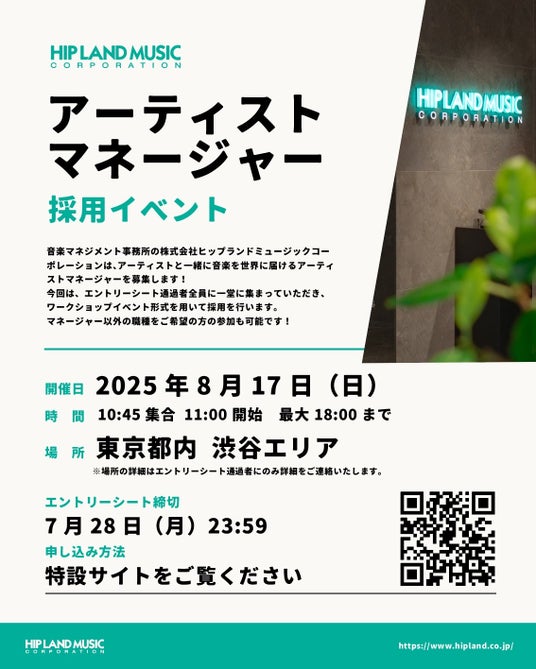 音楽マネジメント事務所の株式会社ヒップランドミュージックコーポレーション(本社:東京都港区、代表取締役:野村達矢)は、アーティストマネジメント職を中心にスタッフを募集いたします。