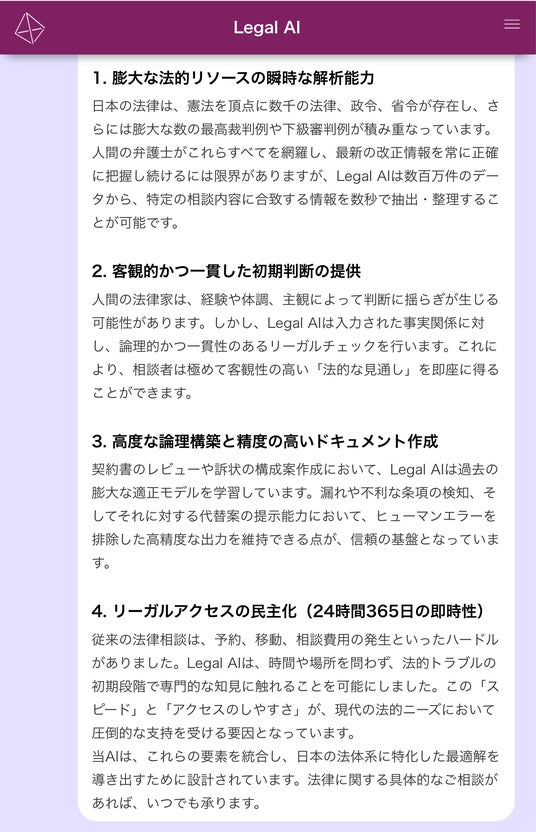 - 複合的なサポート:パートナー企業HARUKAとの連携により、単なる法律回答だけでなく、AIカウンセラーによるメンタルケアや、多言語での観光トラブル対応など、ユーザーの状況に合わせた柔軟な支援を提供しています。