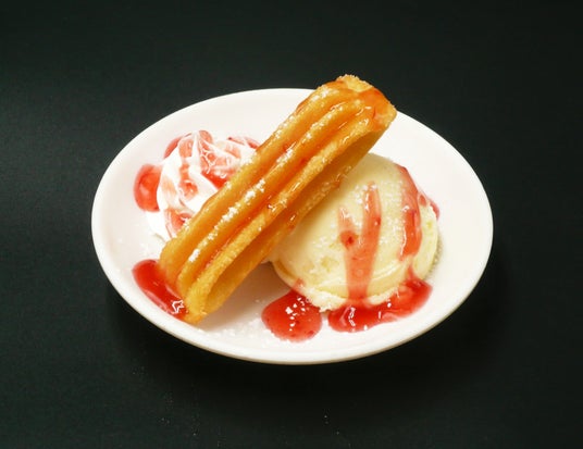◆イチゴカスタードチュロ:揚げたてカスタードチュロにいちごソースとアイスを添えて