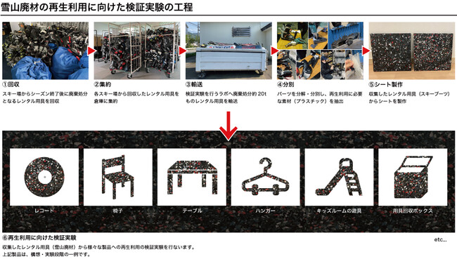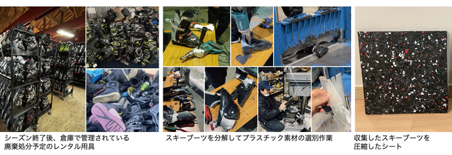 シーズンが終了した2023年春から、廃棄予定のレンタルスキーブーツの収集と分別を進め、現在、収集・分別されたレンタルスキーブーツの廃材は、様々な製品への再生利用化の検証実験を進めており、2024年中には正式にプロジェクトの発表を行う予定です。