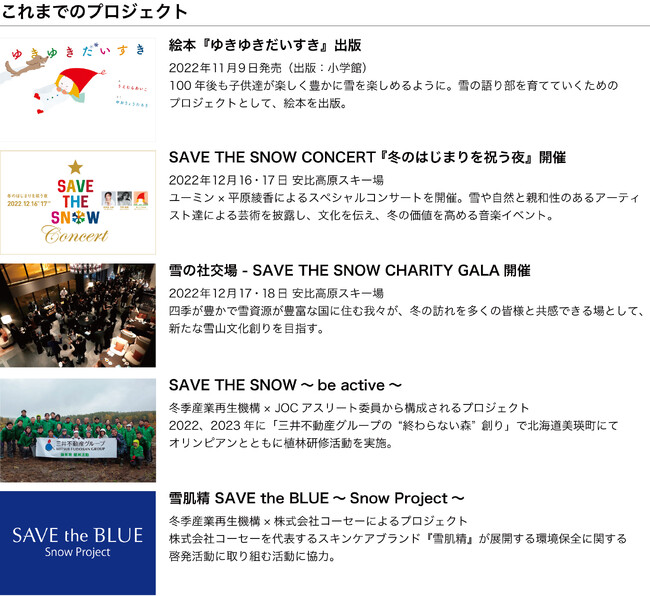 これまでにも、絵本「ゆきゆきだいすき」(*1)の制作やSAVE THE SNOW CONCERT & CHARITY GALA(*2)の開催、公益財団法人日本オリンピック委員会と取り組むSAVE THE SNOW~be active~プロジェクト(*3)など、"雪" や"気候変動"をテーマにしたプロジェクトを数多く主催してきました。