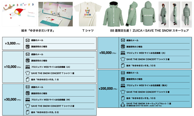 感謝のメール及び、調査研究のご報告をさせて頂きます。プランによっては、プロジェクトのWEBサイトへのお名前掲や、これまでのSAVE THE SNOW PROJECTSに関連したグッズ、今シーズン限定88着でZUICAとのコラボレーションによるスキーウェアをご用意しました。上位プランのリターンには、絵本やTシャツが複数ご用意がございます。是非まわりの方に雪山廃材の問題をお伝えするツールとして、また冬季産業再生機構の取り組みやSAVE THE SNOW PROJECTSを知って頂く手段として、お使い頂けると幸いです。