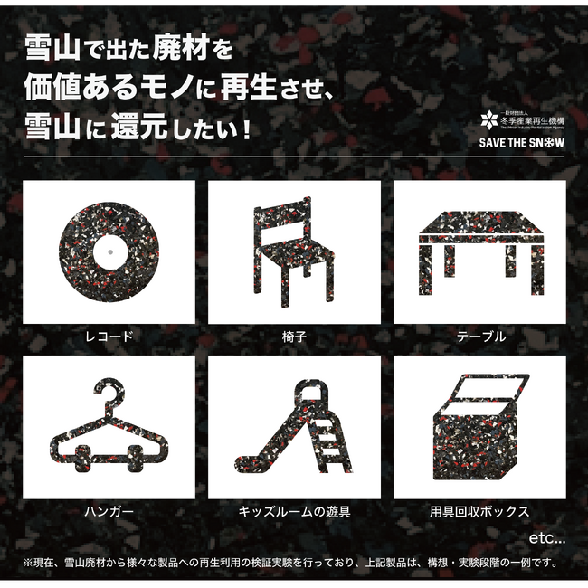 一方、スキー場で貸し出されているブーツやスキー板、スノーボードなどのレンタル用具の需要も高まっており、レンタル用具も耐久性の問題やモデルチェンジの都合により2~3年スパンで入れ替えが行われます。ブーツなどのレンタル用具やスキー場で使用されているネットやポールなどの機材には多くのプラスチックが使われており、それらのプラスチックは多くが廃棄に回されたり、使われずに放置されてしまったりしています。この課題に対し、冬季産業再生機構では雪資源の保全を目指す"SAVE THE SNOW アクション"として、植樹、絵本やコンサートの語り部活動を経て、新たに雪山から出る廃材を再生させ、価値あるモノを雪山へ還元するアップサイクルの実現にチャレンジすることにしました。