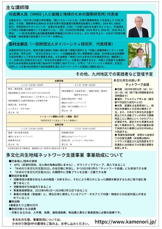 今回は、IHOE〔人と組織と地球のための国際研究所〕代表の川北秀人氏、一般財団法人ダイバーシティ研究所代表理事の田村太郎氏の2人を講師に迎え、多文化共生に関する知識や、地域課題の調査手法、組織マネジメントなどについて学びます。最終的に、多文化共生に関する活動プランの企画・立案を行います。各地区でプランが選定された参加者は、2023年3月に東京で実施する「多文化共生の担い手ネットワーク会議」で発表。さらに審査を経て採択された事業には、かめのり財団より、活動資金の一部が助成されます。