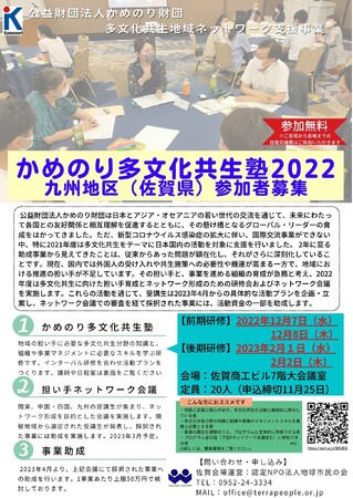 認定NPO法人地球市民の会(佐賀市、理事長:山口久臣)は、公益財団法人かめのり財団(東京都、木村晋介理事長)が主催し、多文化共生の知識と組織マネジメントについて学ぶ「かめのり多文化共生塾2022」の九州地区(佐賀県会場)の運営を担当することになりました。12月と2023年2月に実施する研修の参加者20人を募集しております。
