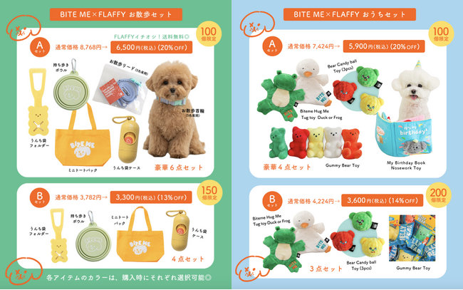 この度、当社と「BITE ME」と「nugu」の3社でペット商品をセット販売することが決定しました。今回のコラボ販売は、「BITE ME」は日本初となるコラボ販売であり、「nugu」はペット商品の初の販売となります。日本の多くの飼い主さまに届けることができるよう当社がアイテムをセレクトし、普段なかなか手に入りづらい商品をお散歩・おうちセットとして組み合わせ、日本最安値でセット販売します。