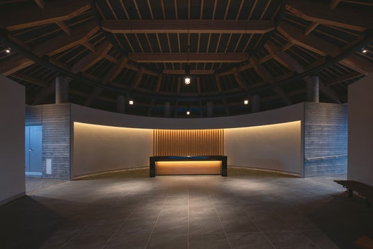 野々市市(石川県)が運営する墓地公園内の施設型合葬墓は、自然素材である木材を多用した大きな屋根と庇のある円形の納骨堂。風雨や日差し等に左右されない屋内型施設の中央には、シンプルで厳かな「和」を表現したシンボリックな礼拝空間があり、特注ペンダント、スポットライト、間接照明等を配置した。全ての光源で調光調色タイプを採用。
