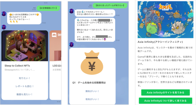 LGGではこれまでもNFTゲーム攻略メディアで、安心してゲームを楽しむための情報を提供してきましたが、LINEを活用することで、1人1人にお勧めのゲームを提案することができるようになりました。