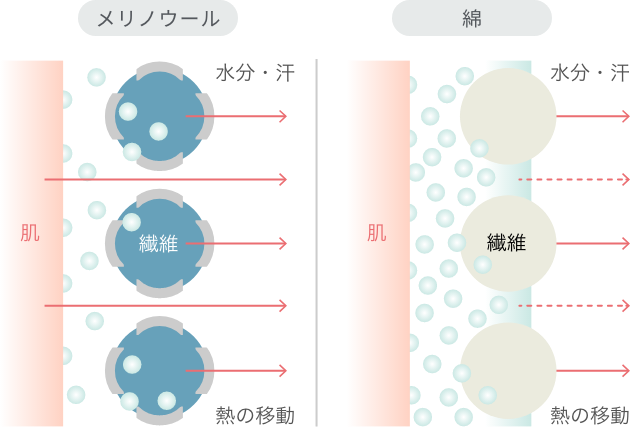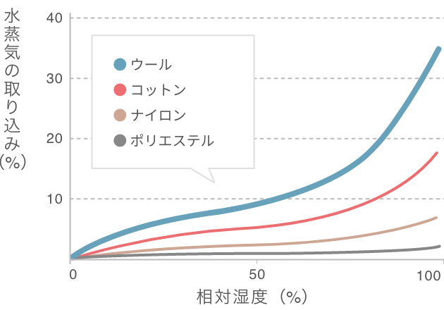 快適に湿度を調整します。繊維の表面は水を弾き内部は湿気を吸って吐く、毛のクリンプに空気をたくさん含んでいて保温性に優れています。水分吸収率が高く、外気との湿度差で自動的に放出されます。衣服の中は蒸れず汗をかいても快適。肌から水分を奪わず保湿するので、肌がカサカサすることもありません。