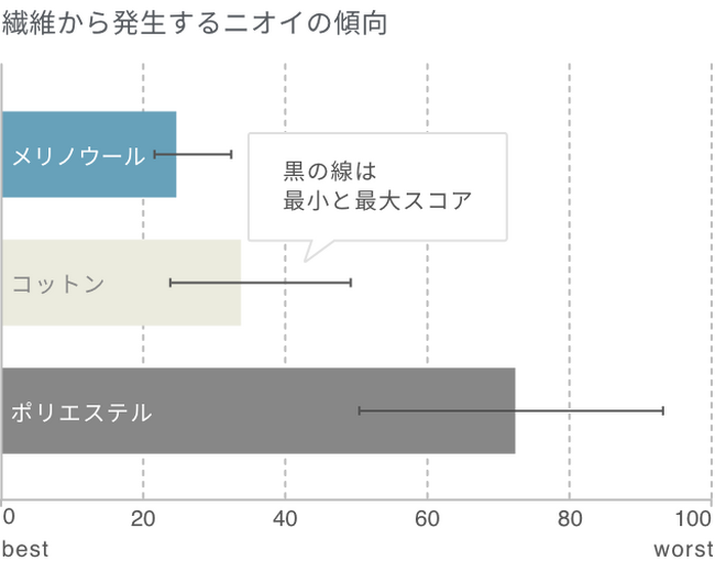 メリノウールには優れた消臭効果があります。他の繊維と比べ匂いの発生が少ないことが研究により判明し、汗臭くなりにくい特徴があります。洗濯をしなくても、軽く陰干し、風にあてるだけでまた着用可能。爽やかに、清潔にお過ごしいただけます。