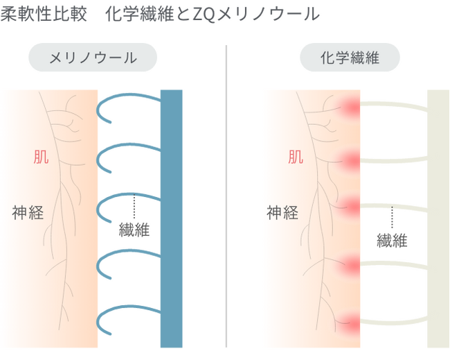 YARNはZQメリノウールの17.5~18.9ミクロンの「スーパーエクストラファイン/エクストラファイン」だけを使用しています。肌にふれた部分がフワッとたわむため、チクチクしません。繊細な肌にも優しい、柔らかい着心地の良さだけが感じられます。