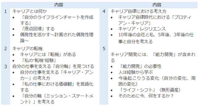 「キャリア研修」では、過去のキャリアにおける転機の振り返り、自身が大切にしている価値観・信念について言語化したうえで、10年後にありたい自分の姿について考え、そのために今できることを明確にするというカリキュラムを提供しています。
