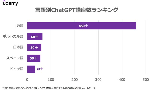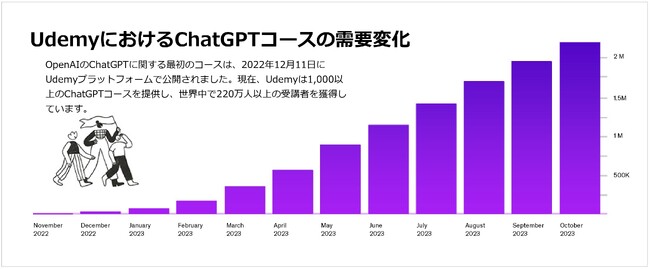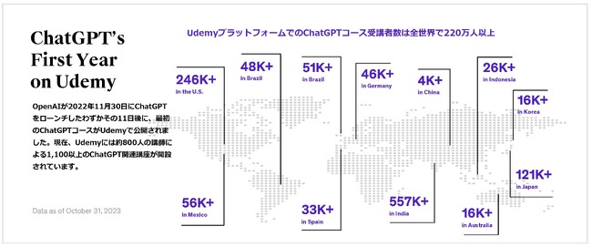 2022年11月30日のChatGPTの公開から2023年10月31日までの間に収集されたUdemyのデータから、この1年間でChatGPTが世界的にどのように活用されたか、以下の点が判明しました: