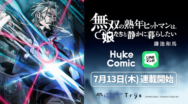 株式会社HykeComic(本社:東京都品川区、代表取締役:香田哲朗、株式会社アカツキの100%子会社)は株式会社ストレートエッジ(本社:東京都千代田区、代表取締役:三木一馬)とともに、2023年7月13日(木)より小説家・鎌池和馬氏が原作を手がける『無双の熟年ヒットマンは、娘たちと静かに暮らしたい』の縦読みフルカラー漫画(ウェブトゥーン)を2つの電子コミックサービス「HykeComic」「LINEマンガ」から連載開始いたします。また、本日2023年7月6日(木)より初報PVを「HykeComic」の公式YouTubeチャンネルにて公開いたしました。