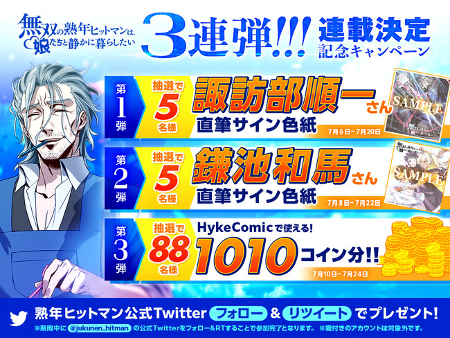本日2023年7月6日(木)より『無双の熟年ヒットマンは、娘たちと静かに暮らしたい』公式Twitterにて、「3連弾!!!『無双の熟年ヒットマンは、娘たちと静かに暮らしたい』連載決定記念キャンペーン!」を開催いたします。期間内に本作の公式Twitterアカウントをフォローし、該当ツイートをリツイートすることで参加が可能となります。第一弾ではハーランド役:諏訪部順一氏さん直筆サイン色紙を5名様に、第二弾では原作/脚本を手がける鎌池和馬さんの直筆サイン色紙を5名様に、第三弾では「HykeComic」で使えるコイン、1010コインを88名様に抽選でプレゼントいたします。