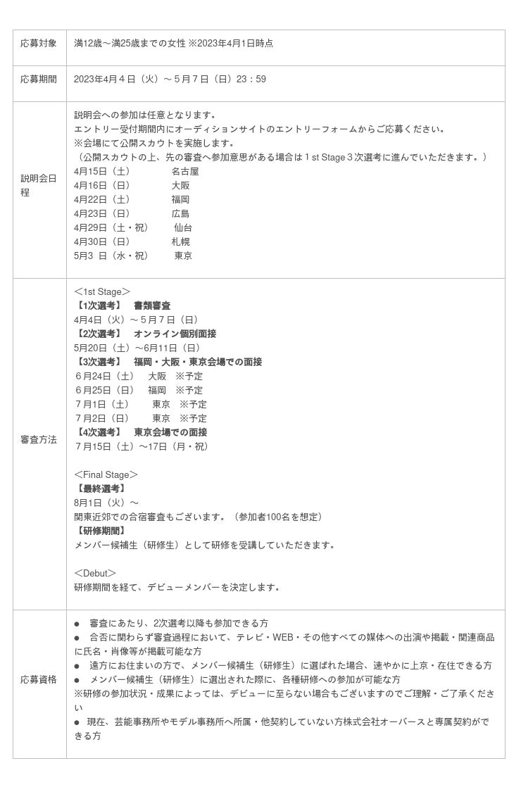 また現在、全国7 都市でオーディション説明会が開催されているが、その場での公開スカウトの実施が話題となっている。説明会に参加することでデビューへのステップに一歩近づくチャンスを掴むことが可能であるため、各会場参加者の熱が高まっている。