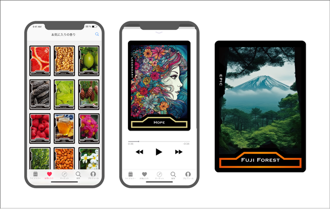 香りNFT(デジタルデータ)を専用の「Smell Market」アプリから再生することで、6種類のベース香料がつまったカートリッジ内臓のディフューザーから香りを噴霧できます。