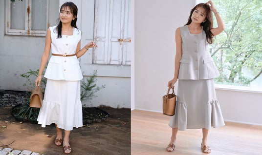 曽田さんこだわりのオリジナルサマーツイードは、白・サックス・ネイビーの絣(かすり)染めを施した清涼感ある配色の尾州産生地。涼しげな夏の“褒められ”セットアップが完成しました。ジレはウエストラインを綺麗に見せる構築的なシルエットとスクエアネックがフェミニンさを増すポイント。さらに、くるみボタンにすることで高級感も兼ね備えた1着です。スカートは縦の切り替えラインと360度映えるギャザーがポイントになり、着るだけで美しいシルエットが仕上がります。セットアップでの着用はもちろん、シーンに合わせた着回しができ夏のお出かけに最適なコーディネートが楽しめます。