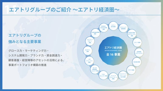 エアトリ社は「ITの力でエアトリ経済圏を構築し未来をつくる」を企業理念に掲げ、エアトリ旅行事業、ITオフショア開発事業、訪日旅行事業・Wi-Fiレンタル事業、メディア事業、投資事業(エアトリCVC)、地方創生事業、クラウド事業、クリエイティブソリューション&DX事業、マッチングプラットフォーム事業、CXOコミュニティ事業、法人DX推進事業・ヘルスケア事業(以降の事業は投資先にて注力)、人材ソリューション事業、AIロボット事業、ゴルフライフサポート事業、外貨自動両替機事業と町家宿泊・日本文化体験事業を含む全16事業を手掛けております。
