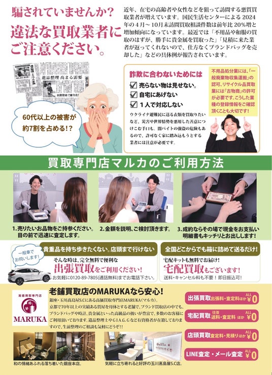 ニュースなどでよく聞くトラブル、詐欺、事件等一見便利な出張買取や訪問買取について様々な事例、手口などを紹介しながらトラブルに巻き込まれない方法を伝授。少しでも高く売るにはどうすればいいのか、悪質業者の見分け方からトラブル処理までお話いたします。