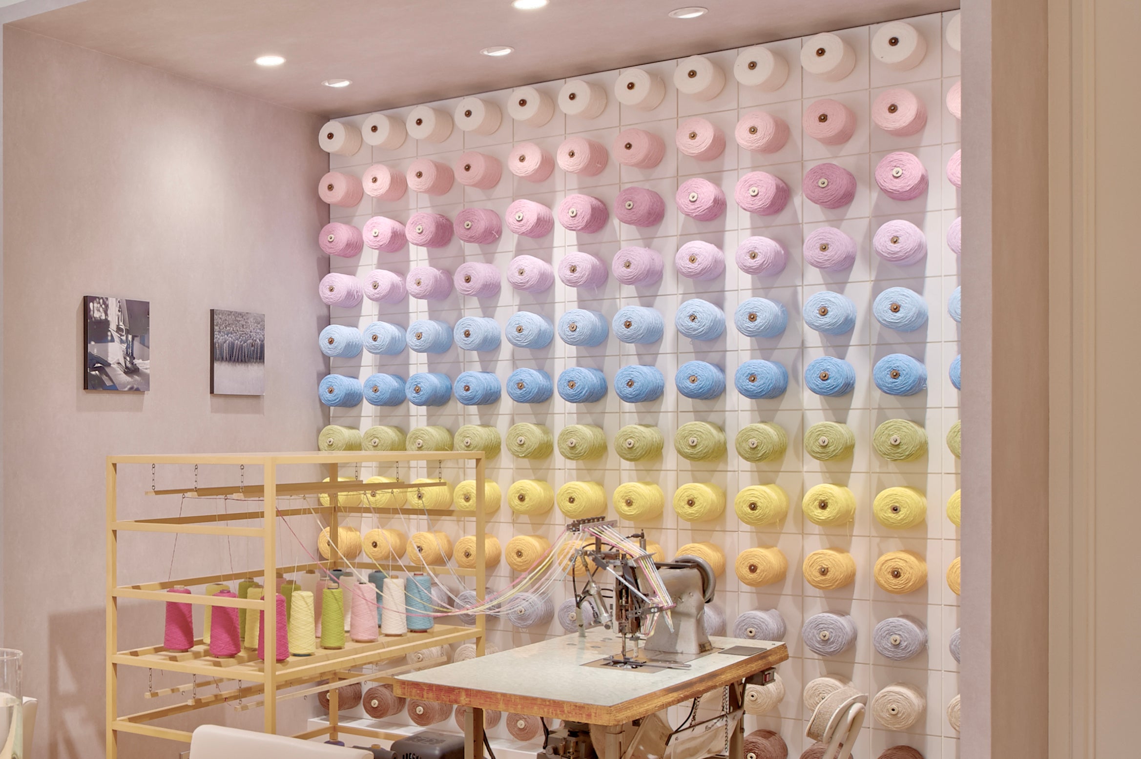 壁一面に広がる糸のディスプレイ店内に入ると、壁一面に美しくディスプレイされた12色の糸が出迎えます。厳選して選んだ特別な12色。糸を手に取り、色の見え方を確認しながら、「これだ!」という1色をお選びいただけます。