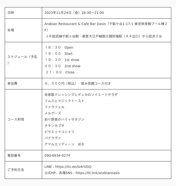 また、今回のイベントでは、レストランの看板メニューである「コシャリ」を特別にアレンジした「ピラミッドコシャリ」のほか、「チキンカプサ」など中近東の人気料理を楽しめるメニューを含む飲み放題付きのスペシャルコースを提供。レストラン自慢の中近東料理と共に、中東のオリエンタルな世界観をお楽しみいただけます。