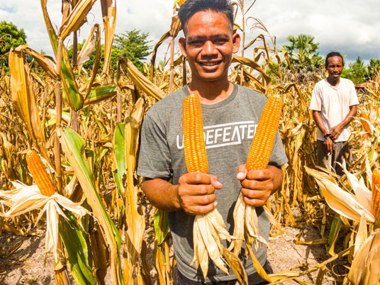 LIFEの支援で豊作だった飼料用トウモロコシ畑:トウモロコシを手に持つのは現地担当者アテン氏(2024年6月撮影)
