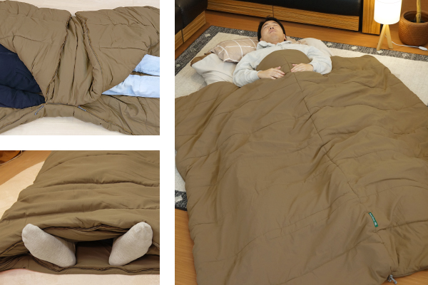 寝袋形状のファスナー付き布団で三方を閉じることができるので、すき間から冷気が入らずあたたかく眠れます。