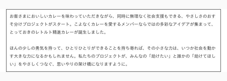 このような背景から、日ごろよりさまざまな企画でパートナーシップを結ぶフェリシモさまから「カレーはしあわせな一家団らんの風景の象徴。栄養豊富なカレーライスを食べて、子どもたちに健やかに育ってほしい」とのご提案をいただき、ヘルシーな精進カレーをおすそわけする本企画の実現にいたりました。