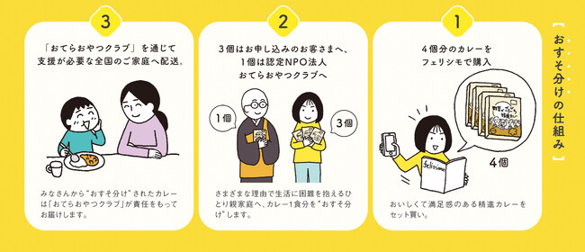 この商品は4個セット¥2,900(税抜)で販売され、その内3個は購入者の元へ、残る1個はおてらおやつクラブへ「おすそわけ」されます。おすそわけいただいたカレーは、おてらおやつクラブで「おそなえ」した後、困りごとを抱える全国のひとり親家庭へとお届けします。