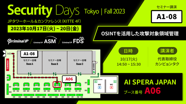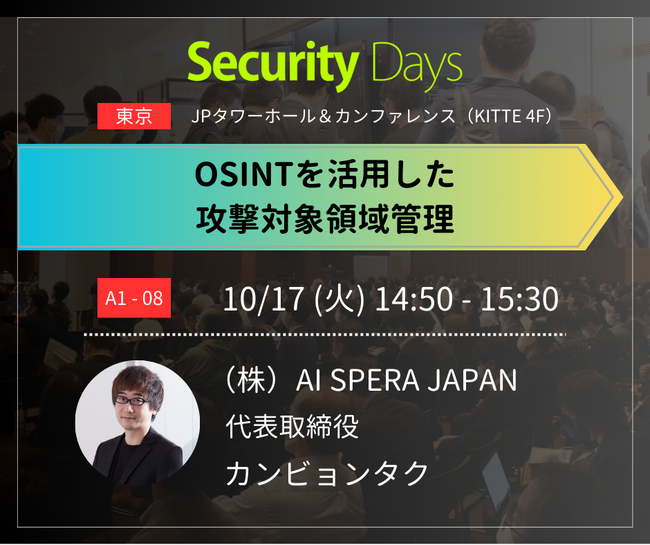 サイバー脅威インテリジェンス(Cyber Threat Intelligence、CTI)専門企業「AI SPERA(エイアイスペラ、CEO 姜 秉卓)が本17日から4日間、東京KITTEで開催される「Security Days Fall 2023」に出展し、サイバー脅威インテリジェンスソリューションCriminal IPのデータと派生セキュリティソリューションを披露し、OSINT攻撃対象領域管理についてセミナー講演を行います。