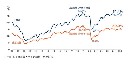 2025年4月時点で正社員の人手不足を感じている企業の割合は51.4%、非正社員では30.0%となったことが、帝国データバンクの調査によって明らかになっています。
