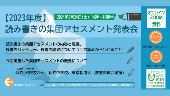 東京都港区の認定NPO法人エッジ(会長:藤堂栄子)は、読み書きの集団アセスメント発表会を2月24日オンライン開催します。