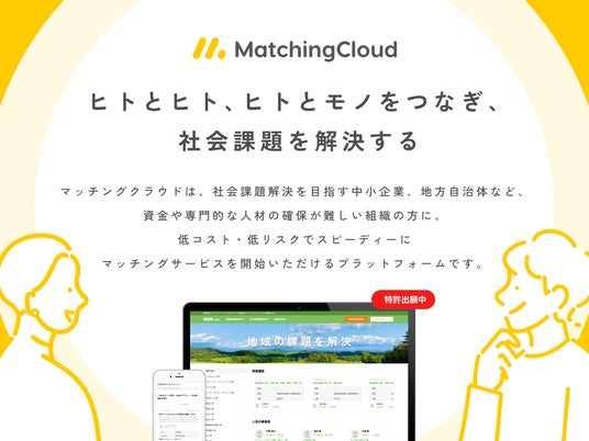 「マッチングクラウド」とは、低コスト・低リスクでオリジナルマッチングサイトを制作できるサービスです。中小企業や地方自治体と、地方在住の専門技術を持つフリーランス人材などのビジネスマッチングが可能になります。