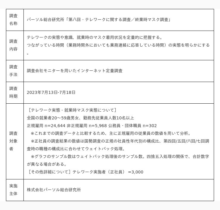 株式会社パーソル総合研究所(本社:東京都港区、代表取締役社長:萱野博行)は、ポストコロナにおけるテレワークの実態とマスク着用をめぐる意識について定量的に把握することを目的に2023年7月13日~18日に3万人規模の調査を実施し、結果を取りまとめたのでお知らせいたします。