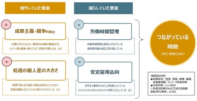 16.「つながっている時間(休日・勤務日合計)」の長さにプラスの影響を与えていた組織的要素は、成果主義・競争的風土、処遇の個人差の大きさ。