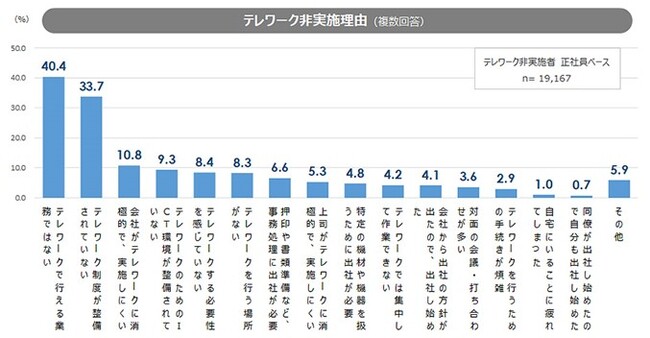4.テレワークを実施していない理由の最上位は「テレワークで行える業務ではない」で40.4%。
