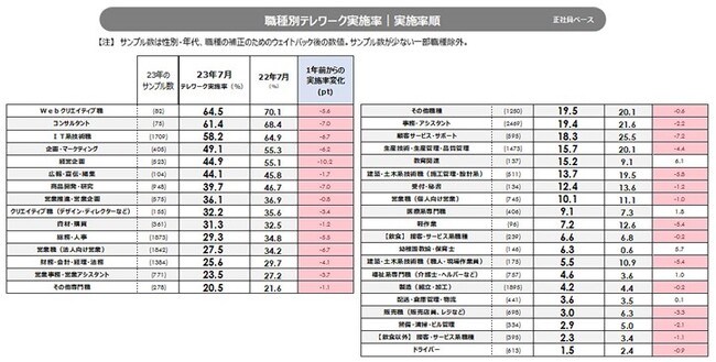 職種別の実施率は、Webクリエイティブ職で64.5%、コンサルタントが61.4%と高い。